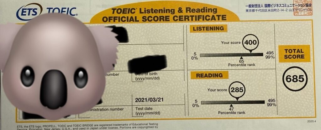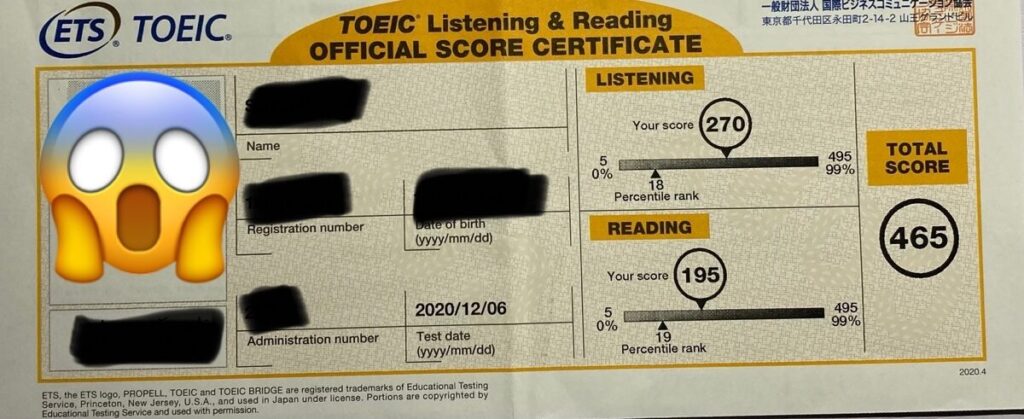 まず初めに12月6日に現在の英語力を知るためにほとんど対策をせずにTOEICを受験しました.結果は465でした.↓